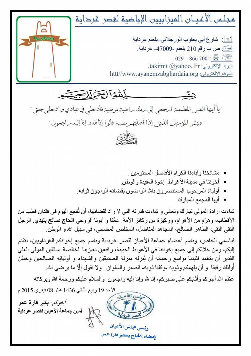كلمة أمين الجماعة لأعيان قصر غرداية